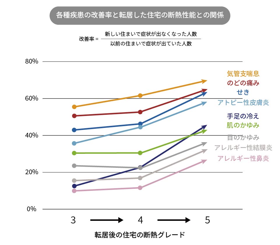 断熱性能を高め、家全体の温度差を少なくすることで、喘息やアトピー性皮膚炎などの症状が改善されるという研究結果も報告されています。