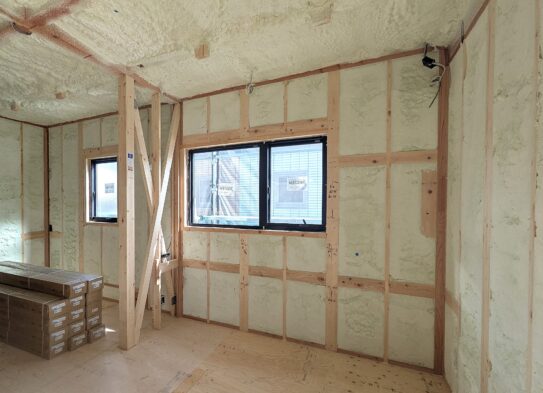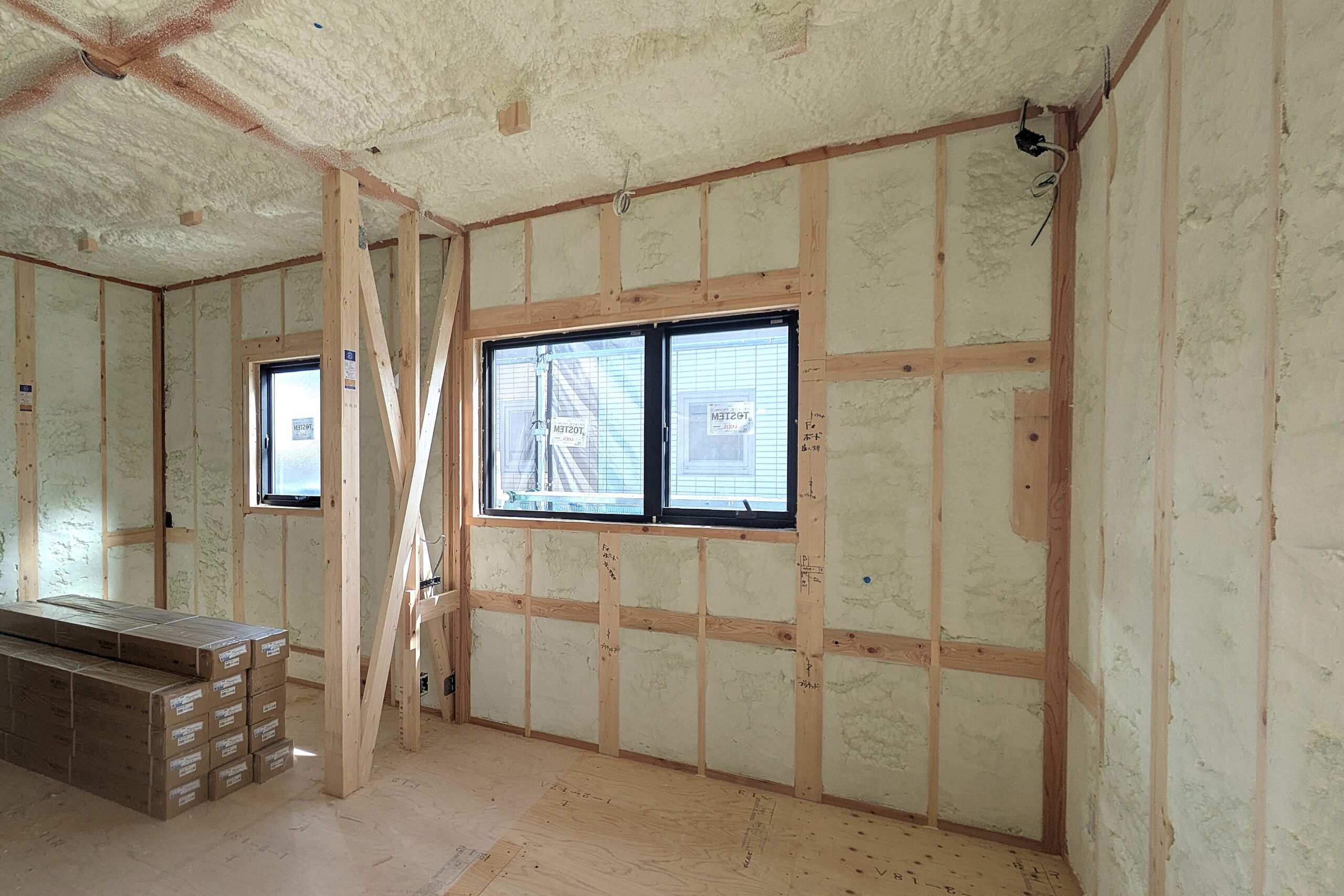 ウレタンを現場で発泡させて壁に密着させる「吹き付け断熱」により、隙間のない高い気密性を確保。魔法瓶のようなぬくもりを実現しています。