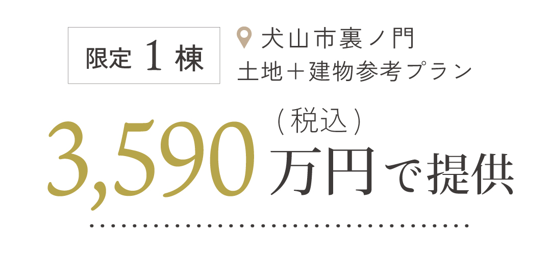 | 価格 | 3,590万円 ※以下の費用は含まれていません ・土地及び建物取得に関わる登記費用、諸税 ・上下水道負担金 ・外構費用 ・融資関連費用 |