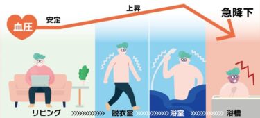 急激な温度変化によって血圧が大きく変動し、心臓や血管に異常が生じる現象で、特に寒い脱衣所から熱い浴槽に入る際に発生しやすいとされています。