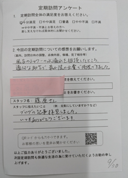 内部の点検でも問題はありませんでしたが、ユニットバスの水栓の水漏れがありましたので、修理先の連絡番号とお伝えしご自身で連絡していただき、なにか心配事があった場合は直接私に連絡していただくようにしました。