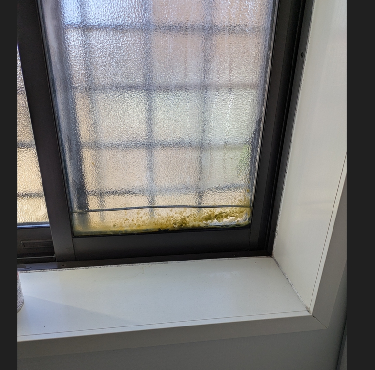 内部では浴室サッシのペアーガラス内に結露が発生し、水が溜まっているために交換をお勧めしました。