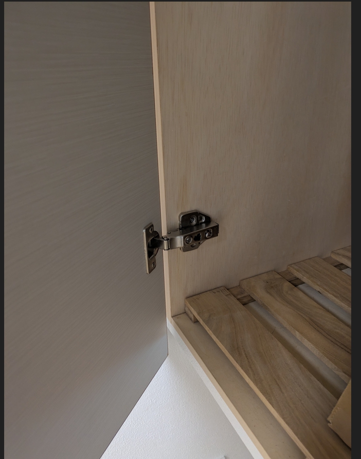 物入の扉の丁番金物が抜け落ちていたため、長めのビスで固定をしました。