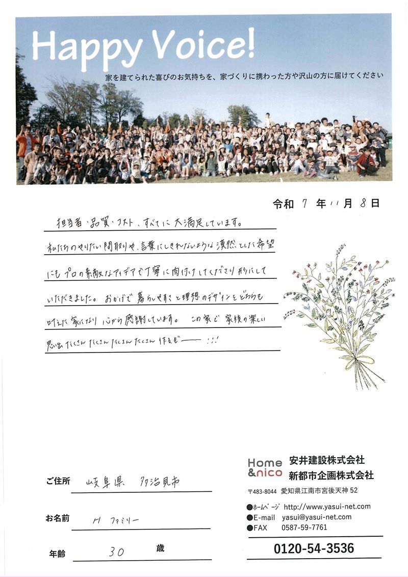 担当者・品質・コストすべてに大満足しています。私たちのやりたい間取りや言葉にしきれないような漠然とした希望にもプロの素敵なアイデアで丁寧に肉付けしてくださり形にしていただきました。おかげで暮らしやすさと理想のデザインをどちらも叶えた家になり心から感謝しています。この家で家族の楽しい思い出たくさんたくさんたくさんたくさん作るぞー!!!