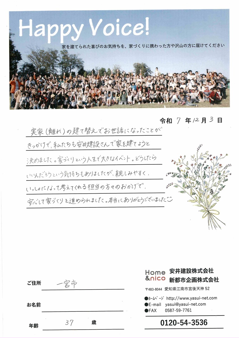 実家(離れ)の建て替えでお世話になったことがきっかけで私たちも安井建設さんで家を建てようと決めました。家づくりという人生で大きなイベント。どうしたらいいんだろうという気持ちもありましたが、親しみやすくいっしょになって考えてくれる担当の方々のおかげで安心して家作づくりを進められました。本当にありがとうございました