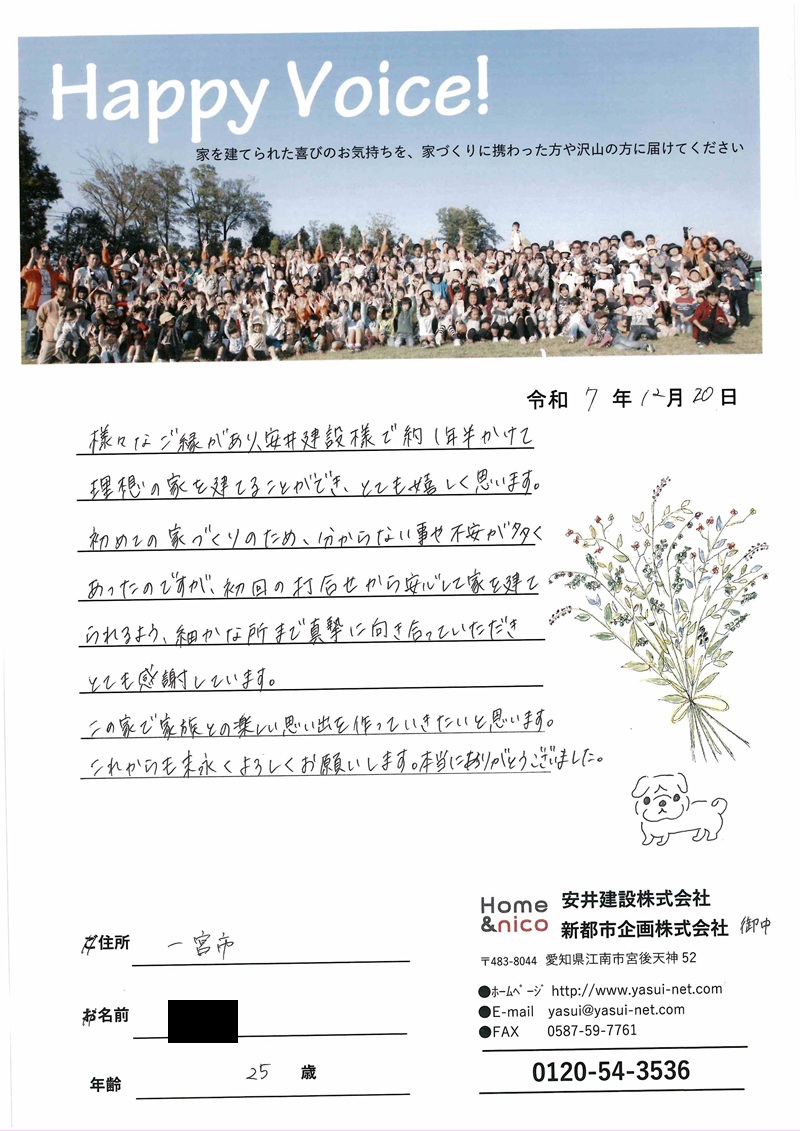 様々なご縁があり、安井建設様で約1年半かけて理想の家を建てることができ、とても嬉しく思います。初めての家づくりのため、分からない事や不安が多くあったのですが、初回の打合せから安心して家を建てられるよう細かな所まで真摯に向き合っていただきとても感謝しています。この家で家族との楽しい思い出を作っていきたいと思います。これからも末永くお願いします。本当にありがとうございました。