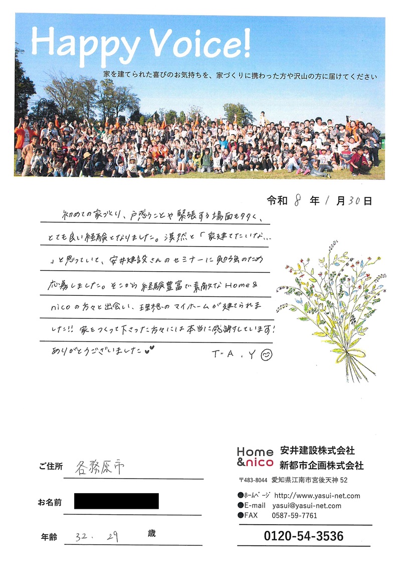 初めての家づくり、戸惑うことや緊張する場面が多く、とても良い経験となりました。漠然と「家を建てたいな・・」と思っていて安井建設さんのセミナーに勉強のため応募しました。そこから経験豊富で素敵なHome&nicoの方々と出会い理想のマイホームが建てられました!!家をつくって下さった方々には本当に感謝しています!ありがとうございました